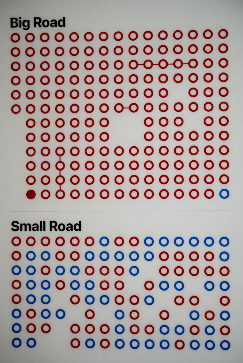 - 紅圈較多或連續紅:表示大路的模式在隔列距離上仍保持高度一致,常見於長龍延續、雙跳或有節奏的交替。此時牌局規律性強,適合跟隨大路趨勢投注。