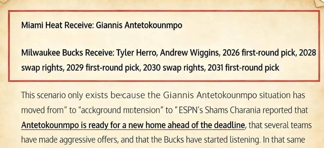 热火送出:希罗、维金斯、2026年、2029年、2031年的首轮签以及2028年、2030年的首轮签互换权