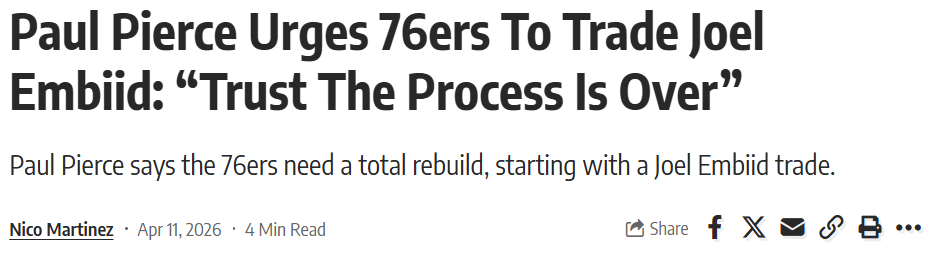费城76人守了十年的“相信过程”,终究还是没扛住伤病的反复折腾和不尽如人意的战绩。随着季后赛的临近,NBA名宿保罗·皮尔斯在节目里直言不讳,一语点破了球队的困境:乔尔·恩比德的伤病隐患,早就成了球队往前跑的最大绊脚石。想让球队重新活过来,其实也简单——送走这位当家球星,围着年轻核心重新起步就好。没人否认恩比德的天赋,也没人忘了他为球队做的贡献,但他的伤病史、年龄,早就和球队的未来规划对不上了,交易恩比德、开启重建,对76人来说,就是最理智的选择。